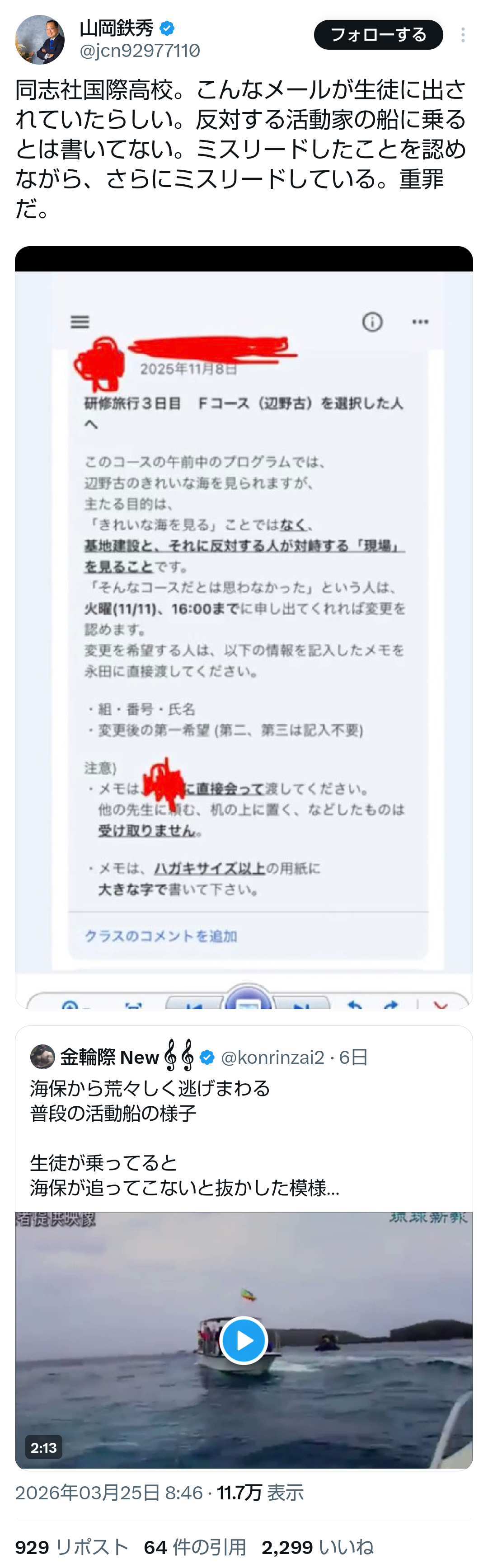 | … | 294無題Name名無し 26/03/25(水)12:14:36No.789146+ 1774408476463.png-(852226 B) >辺野古沖転覆、同志社国際高校の教員「乗船しなかった」ワケ 保護者説明会で紛糾 |