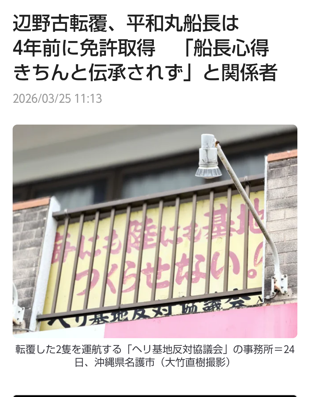 | … | 316無題Name名無し 26/03/25(水)12:56:04No.789168+ 1774410964980.png-(882843 B) >辺野古転覆、平和丸船長は4年前に免許取得 「船長心得きちんと伝承されず」 |