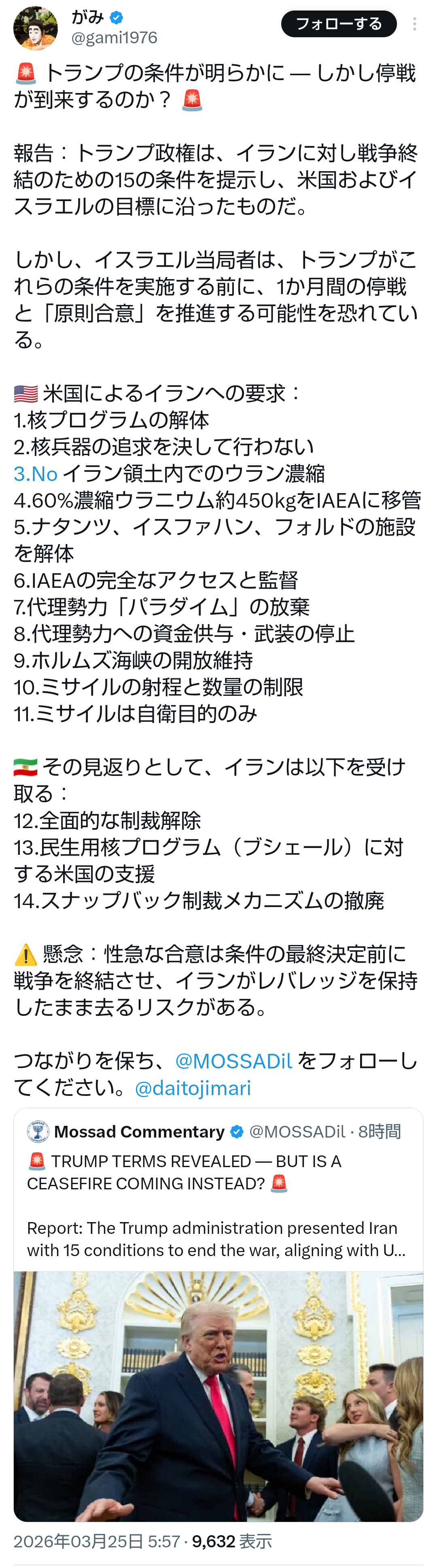 | … | 321無題Name名無し 26/03/25(水)13:18:33No.789173+ 1774412313972.png-(1461886 B) >米国によるイランへの要求: |