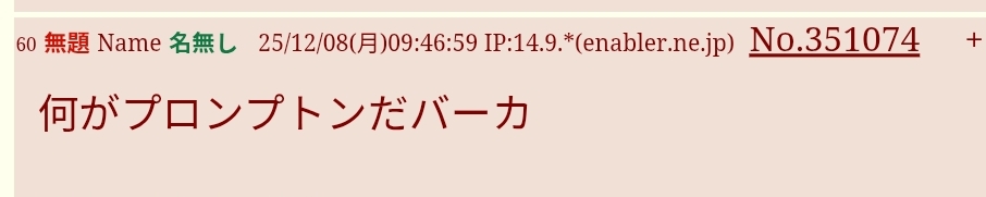 | … | 60なーNameなー 25/12/08(月)09:46:59 IP:14.9.*(enabler.ne.jp)No.351074+なー |