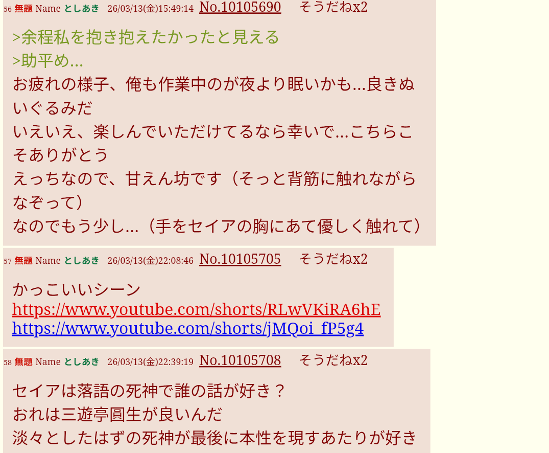 | … | 1無題Nameとしあき 26/03/30(月)12:39:35No.10108394そうだねx1エッチな話なら好物です(上から覆いかぶさってちゅぅぅ |