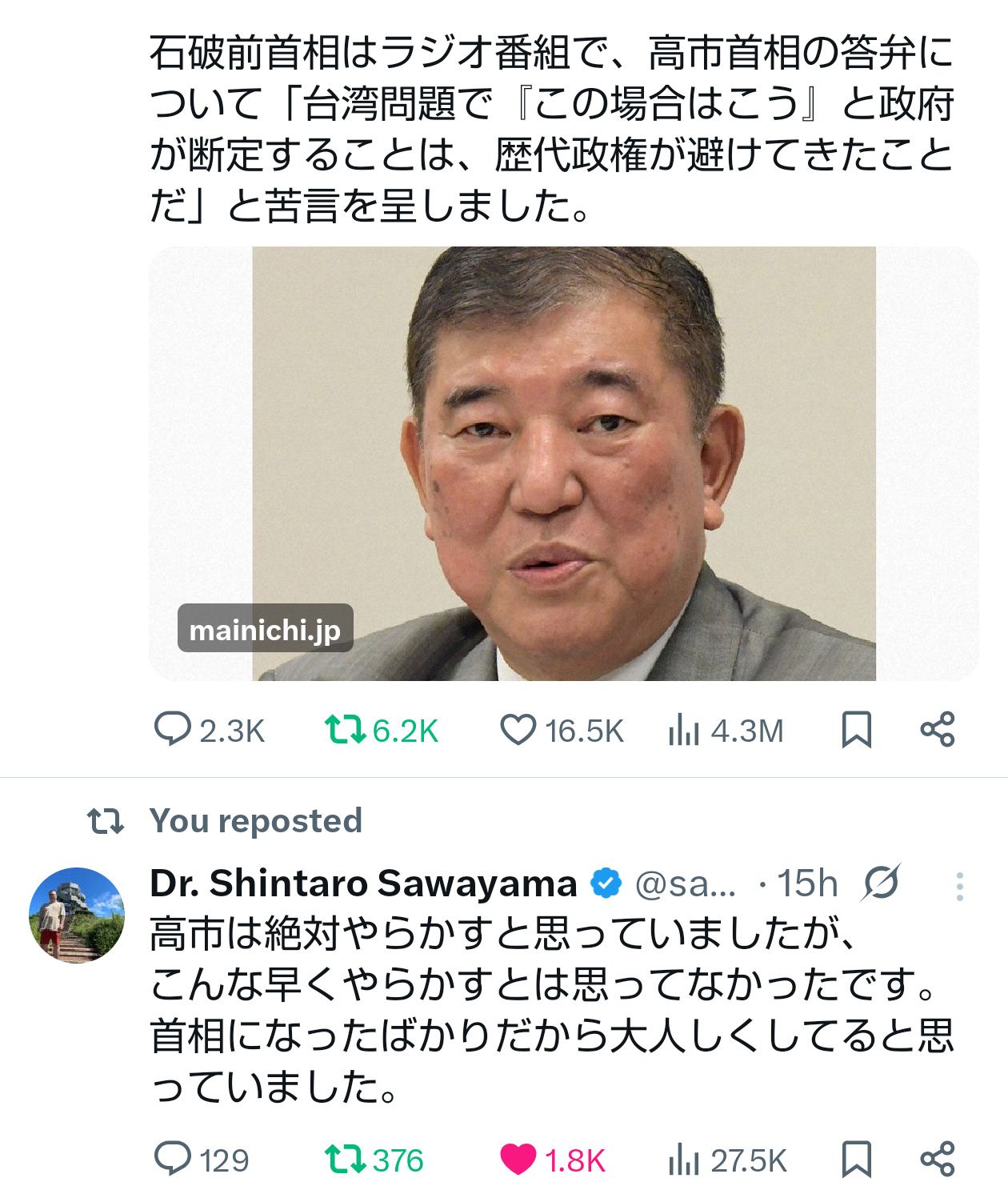 高市の「存立危機事態」発言は、政府統一見解ではない?レス1件省略。全て読むには返信ボタンを押してください。