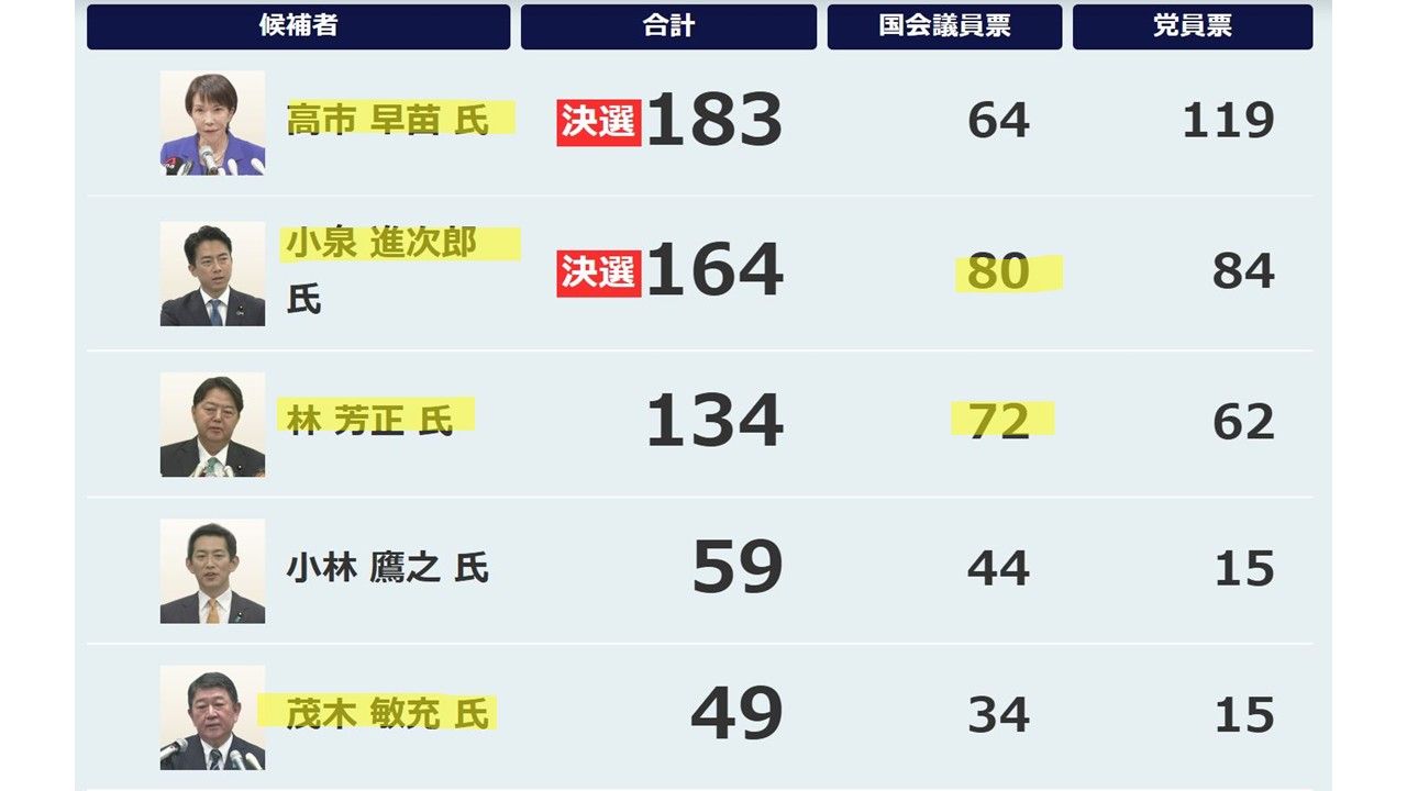 本来、高市の異常な党員票数が無ければ、議員票2位の林芳正氏が決選投票に残ったはずだ。