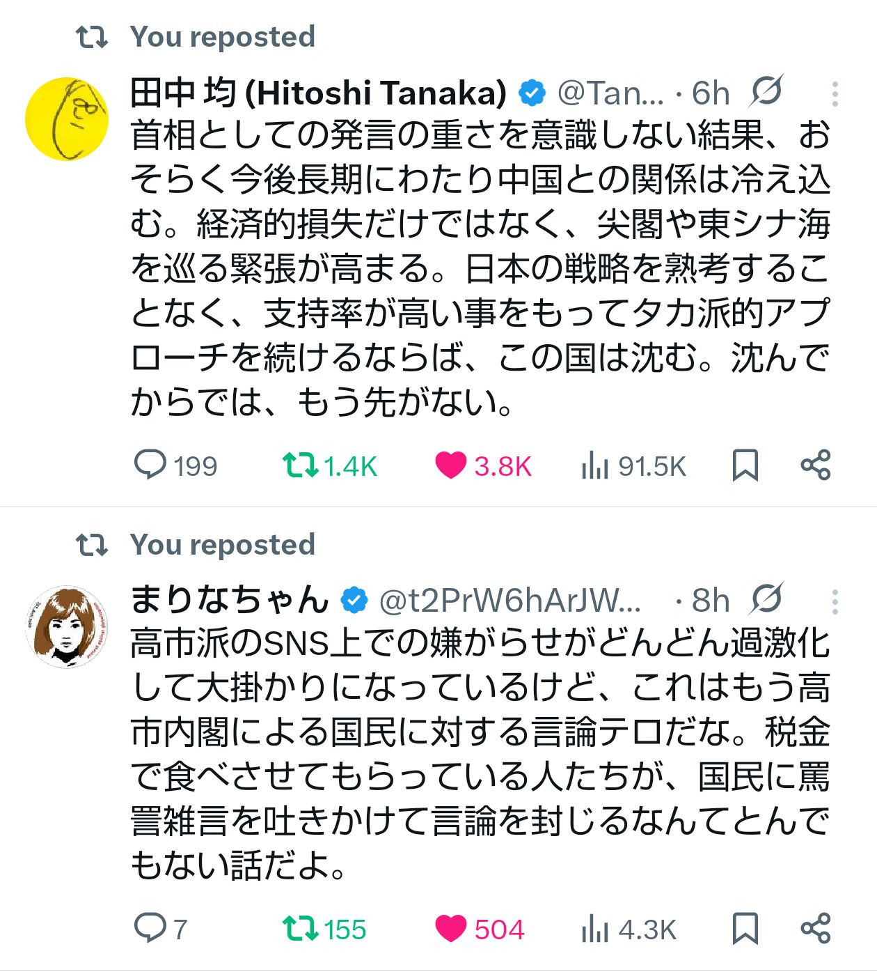 | … | 6無題Name名無し 25/11/25(火)18:53:39 IP:49.98.*(spmode.ne.jp)No.2678995+「ごまかして逃れようとしている」中国外務省報道官 |