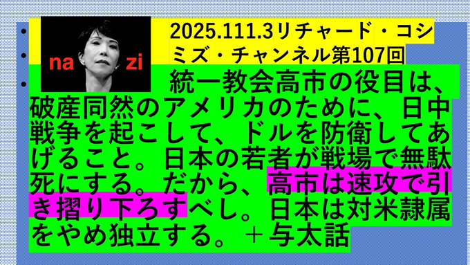 「統一教会高市の役目は、破産同然のアメリカのために、日中戦争を起こして、ドルを防衛してあげること。