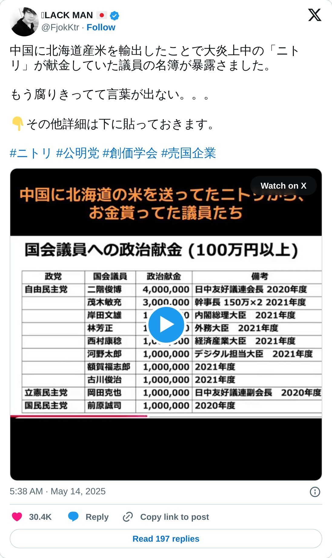 つまり、高市閣下は、統一教会の重鎮、笹川一派の3000万円を貰っちゃったわけね。