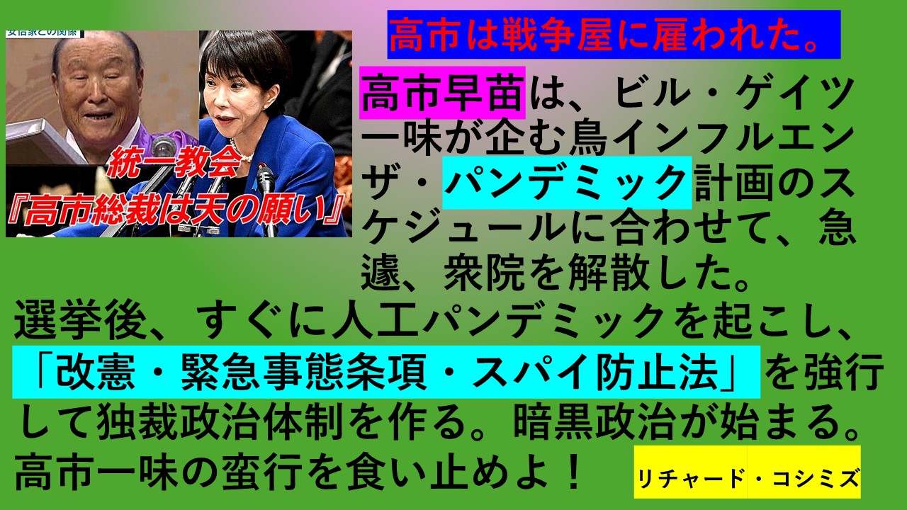 高市は、ウイルスとワクチンで日本人を大量に殺す計画を、選挙後すぐに発動する。