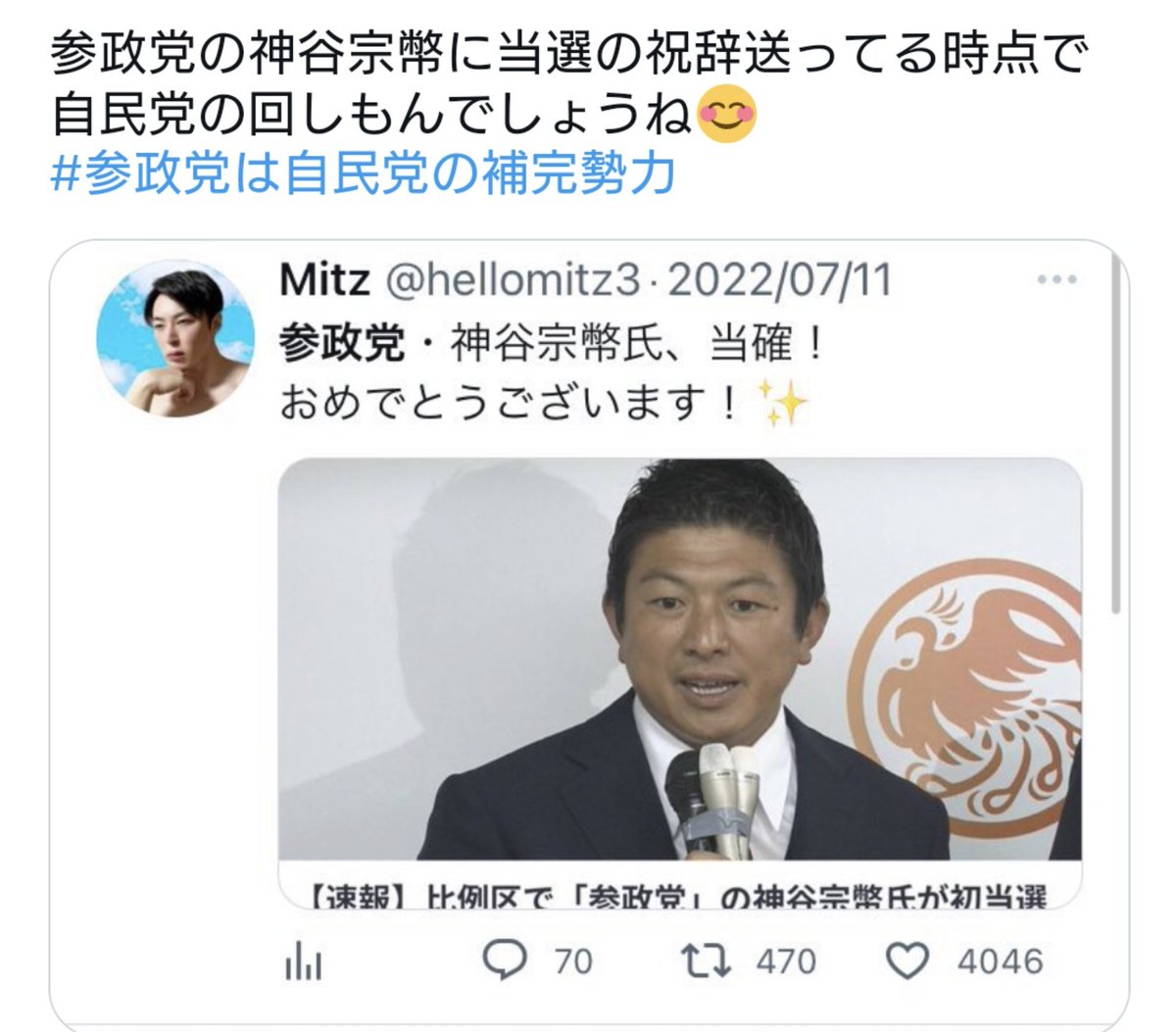 神谷が必死に参政党と朝鮮カルト統一教会の関係を隠しているのに、韓鶴子を崇拝する壺売り信者が、参政党の応援なんかしちゃだめでしょうが。