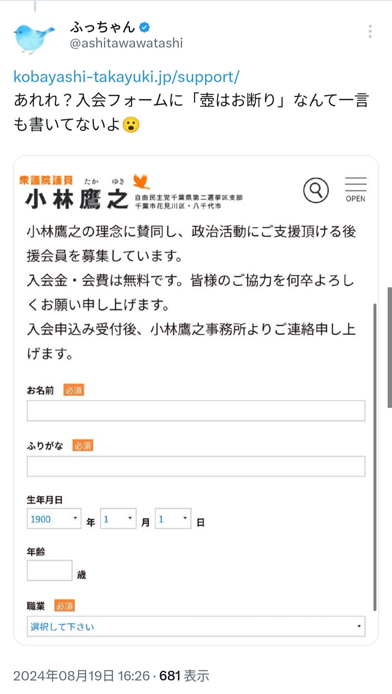 … | 14無題Name名無し 25/10/18(土)13:53:40 IP:58.158.*(ucom.ne.jp)No.2669546+ 1760763220811.jpg-(324822 B) ![]() 壺ホーク・小林鷹之氏の後援会に統一教会幹部が複数いることを確認 |