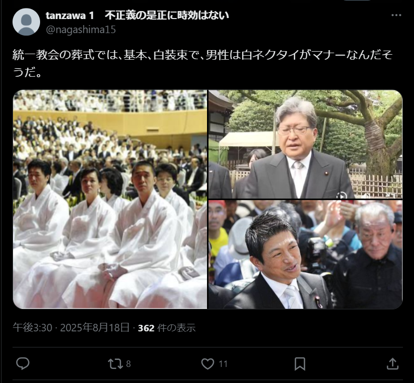 参政党の神谷達の白ネクタイは、韓国式の葬式の白装束を意味するでしょう。