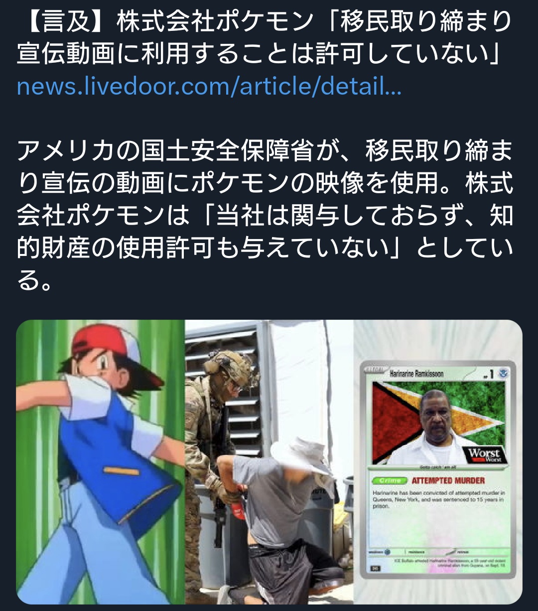 アメリカで9月22日、国土安全保障省が不法移民の取り締まり映像と人気アニメ「ポケモン」を組み合わせたPR動画をSNSに投稿した。主題歌やカード風画像を使い、逮捕された不法移民をポケモンカードになぞらえた内容だった。株式会社ポケモンは、一切関与していないという。