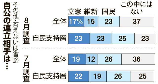 この世論調査、面白いですね。自民の連立相手候補として、参政党の名前がありません。朝日の背後のDSが、高市自民極右+参政党政権は、望まないということでしょうか。https://x.com/sasasanosasayan/status/1958835994066550991