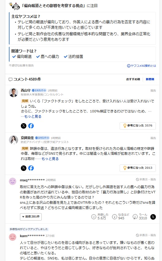 … | 31無題Name名無し 25/10/02(木)21:39:07 IP:126.65.*(bbtec.net)No.2664061そうだねx20>>日本テレビは2日、報道番組「news every.」で放送された奈良公園(奈良市)のシカを巡るVTRについて、「取材で確認が取れた情報をお伝えしたもの。取材にお答えいただいた方や無関係の方に対し、誹謗(ひぼう)中傷や迷惑行為等を行うことは、厳に慎んでいただきたくお願い申し上げます」とするコメントをホームページ上で発表した。 |