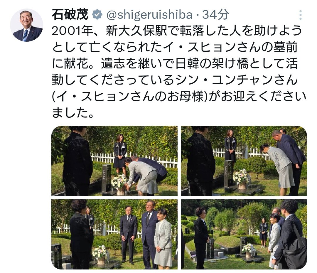 >日本人を助けようと亡くなった韓国人の方に寄り添う石破首相❗️