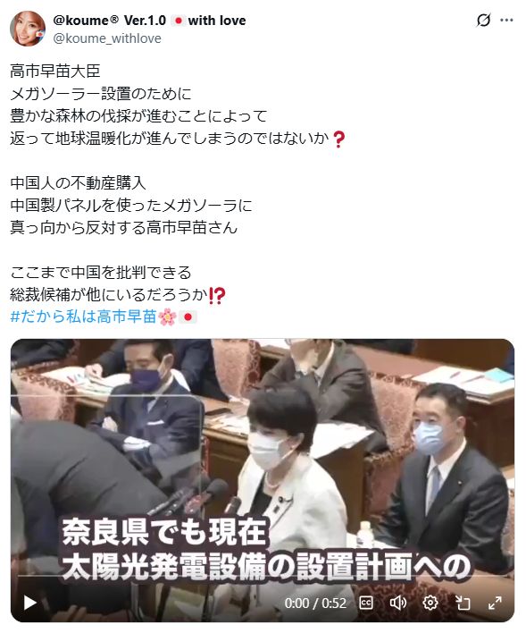 メガソーラの最大の問題点は、30年程度で寿命の来た中古パネルの処分を義務化して環境破壊を食い止めること。高市がそれを真っ先にやるか?多分、やらない。処分費用の負担をしたくない産業界の抵抗が大きくて、面倒だから。結果、放置され、損壊した中古パネルから、ヒ素など有害物質が流れ出して、水田に流入。日本には、汚染米しか存在しなくなる。ヒ素米とカドミウム米。下手をすると飲料水まで汚れる。