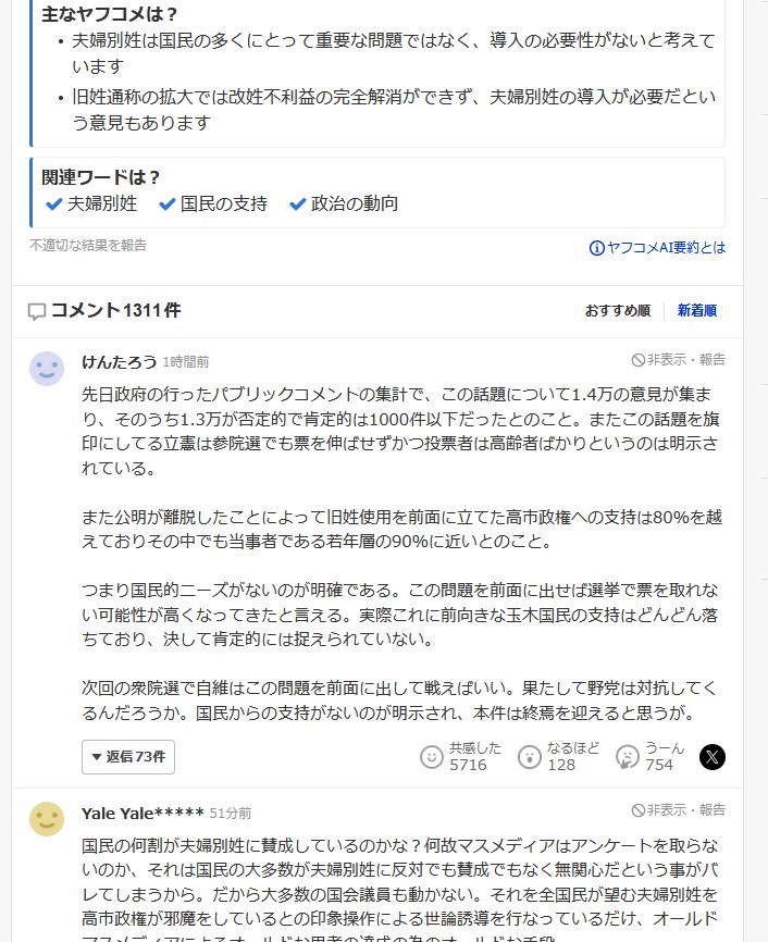| … | 48無題Name名無し 25/11/03(月)18:02:43 IP:106.150.*(dion.ne.jp)No.2673875そうだねx27 1762160563605.jpg-(182761 B) 夫婦別姓「実現の動き止まった」 通称で自維合意、法案審議に影響 共同 |