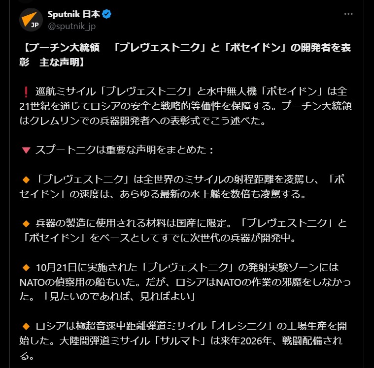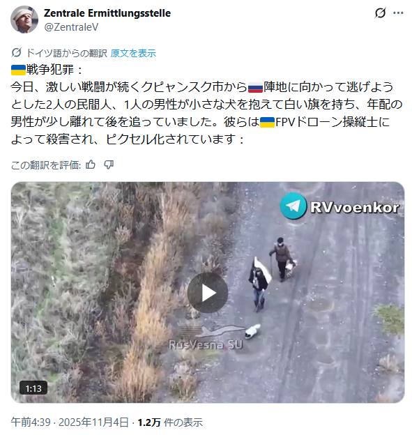 | … | 390無題Name名無し 25/11/06(木)01:10:08 IP:180.38.*(ocn.ne.jp)No.2674488+ロシア、東部2都市でウクライナ軍包囲と主張 降伏呼びかけ |