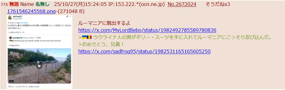 | … | 45無題Name名無し 25/11/03(月)15:32:16 IP:153.222.*(ocn.ne.jp)No.2673870そうだねx13 1762151536553.png-(352735 B) >ウクはキチガイの実験国家か何かか |