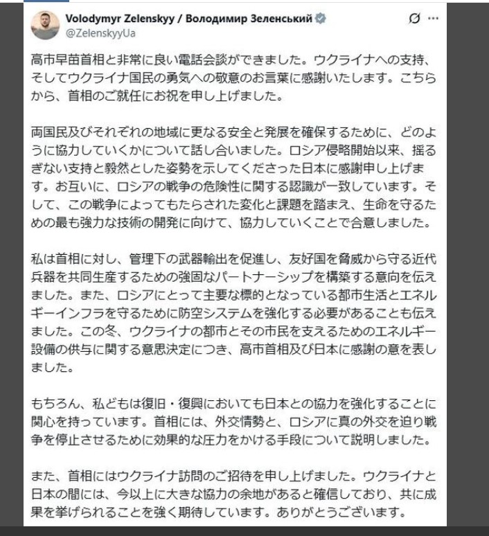 | … | 382無題Name名無し 25/11/06(木)00:06:13 IP:106.150.*(dion.ne.jp)No.2674471そうだねx13 1762355173397.jpg-(199776 B) ゼレンスキー大統領、SNSに日本語で「ウクライナ国民の勇気への敬意のお言葉に感謝」高市首相と電話会談 |