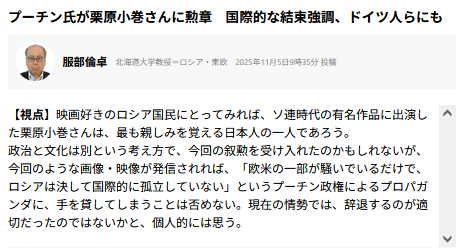 | … | 422無題Name名無し 25/11/06(木)11:43:38 IP:153.222.*(ocn.ne.jp)No.2674528+ 1762397018154.png-(59112 B) >プーチン大統領、「モスクワわが愛」出演の栗原小巻さんに勲章授与 記者名なし |