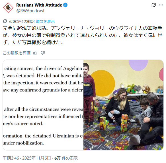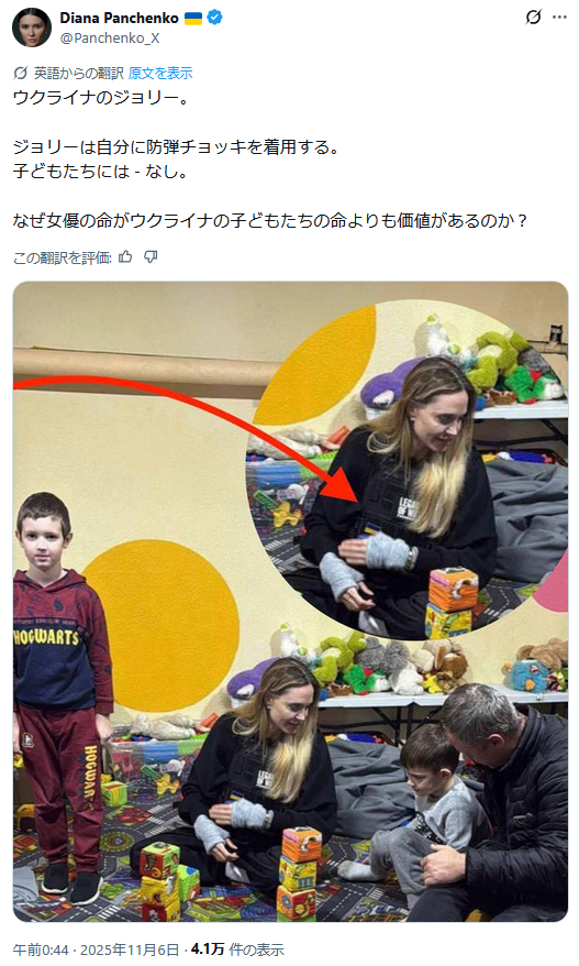 | … | 438無題Name名無し 25/11/06(木)12:29:38 IP:153.222.*(ocn.ne.jp)No.2674544+ 1762399778471.png-(610756 B) 日本メディア「ウクライナのために防弾チョッキをつけねばならないほど危険な場所に赴くアンジェリーナ・ジョリー!」 |