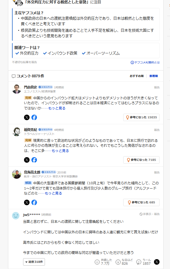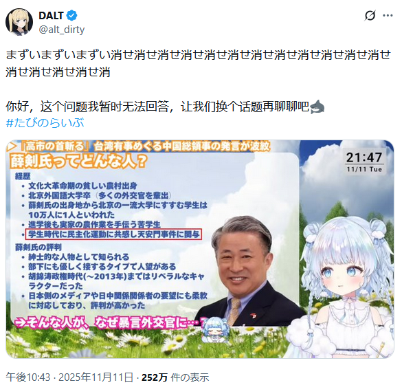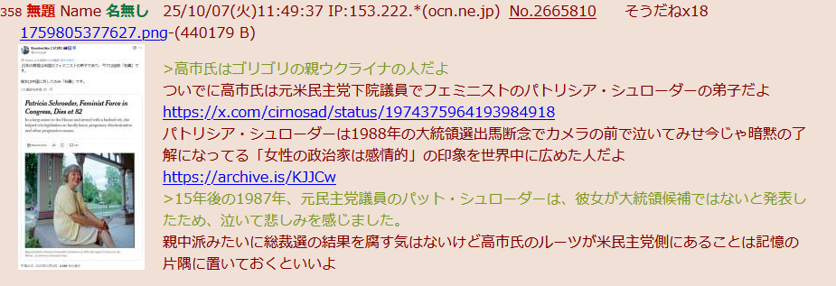 | … | 981無題Name名無し 25/11/17(月)00:53:33 IP:153.173.*(ocn.ne.jp)No.2676846そうだねx21>高市さんの発言が中国怒らせたにしても |
