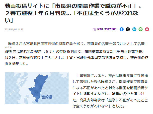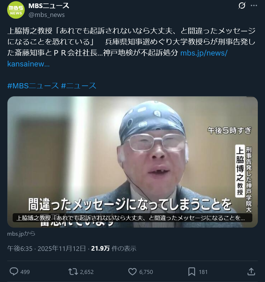 | … | 974無題Name名無し 25/11/17(月)00:30:41 IP:117.55.*(ipv4)No.2676839そうだねx2 1763307041278.jpg-(10937 B) >それはともかく立花が誹謗中傷をしていたことと竹内氏が大した証拠もないまま斎藤知事を追及していたことと立花から擁護されてた斎藤知事は悪い奴なんだという論調は全く別の話なのでそれぞれに相応の評価がされるべきであろうと思う |