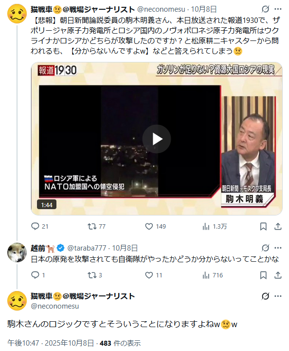 | … | 73無題Name名無し 25/11/11(火)17:22:58 IP:49.97.*(spmode.ne.jp)No.2675509そうだねx12>BBCを引用したTV局も謝罪が必要だよなぁ? |