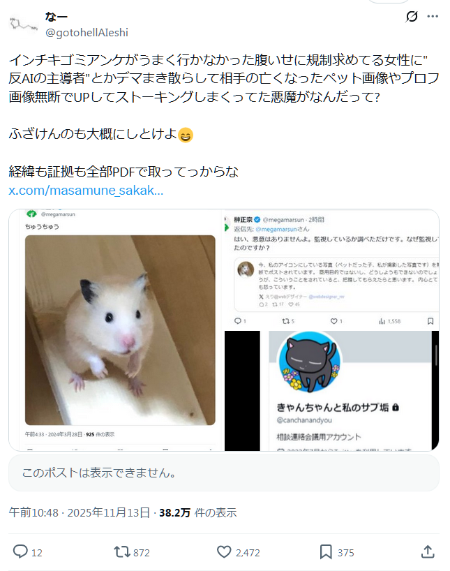 | … | 961無題Name名無し 25/11/16(日)22:49:31 IP:106.146.*(au-net.ne.jp)No.2676826そうだねx2 1763300971094.png-(511026 B) https://x.com/females_db_park/status/1989628442707730885 |
