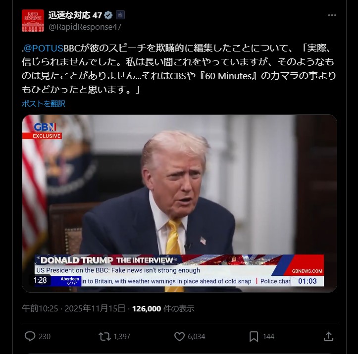 | … | 74無題Name名無し 25/11/11(火)17:24:23 IP:133.106.*(ipv4)No.2675514そうだねx5>BBCを引用したTV局も謝罪が必要だよなぁ? |