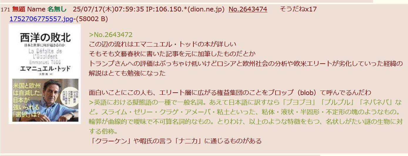 | … | 15無題Name名無し 25/11/11(火)13:30:54 IP:175.177.*(itscom.jp)No.2675426+ 1762835454759.jpg-(2814358 B) ★2025年7月〜8月の出来事まとめ |