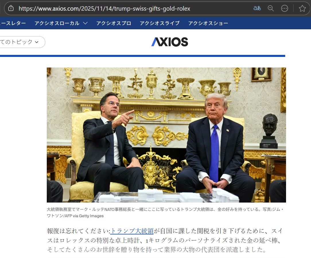 | … | 996無題Name名無し 25/11/17(月)08:58:05 IP:106.150.*(dion.ne.jp)No.2676865そうだねx3 1763337485723.jpg-(220842 B) アクシオス:スイスはトランプへの贈り物のおかげで米国が課した関税を軽減することができた(ロシア語抜粋) |