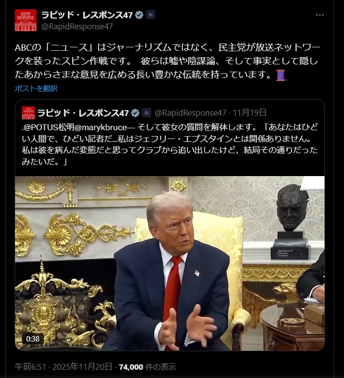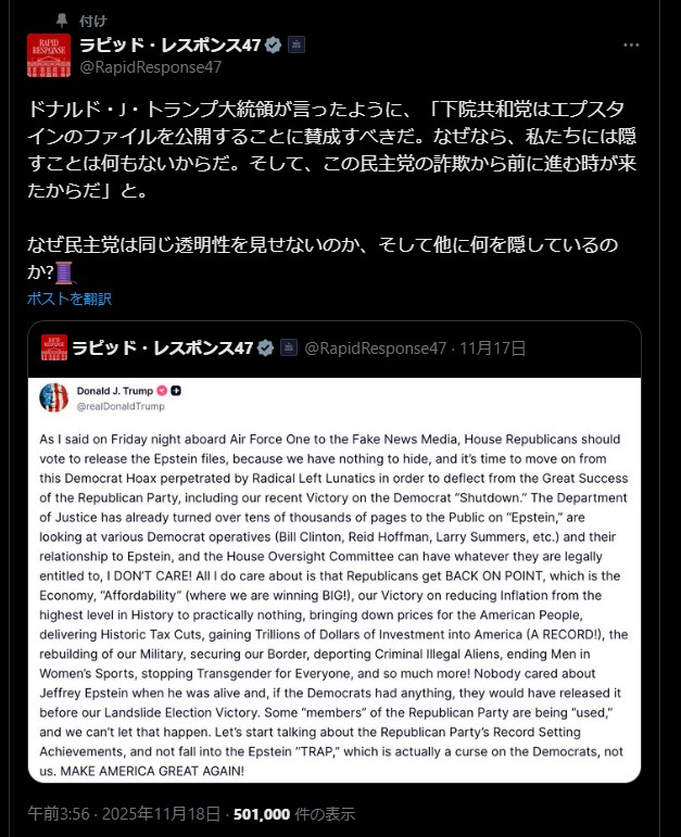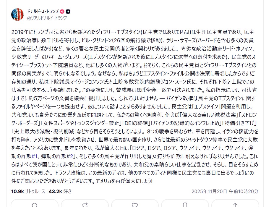 | … | 40無題Name名無し 25/11/17(月)14:10:27 IP:106.150.*(dion.ne.jp)No.2676934そうだねx10 1763356227993.jpg-(122479 B) トランプ氏、エプスタイン文書の公開支持 共和党議員に賛成要請 |