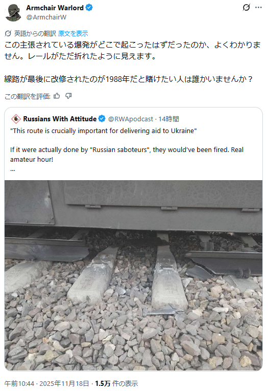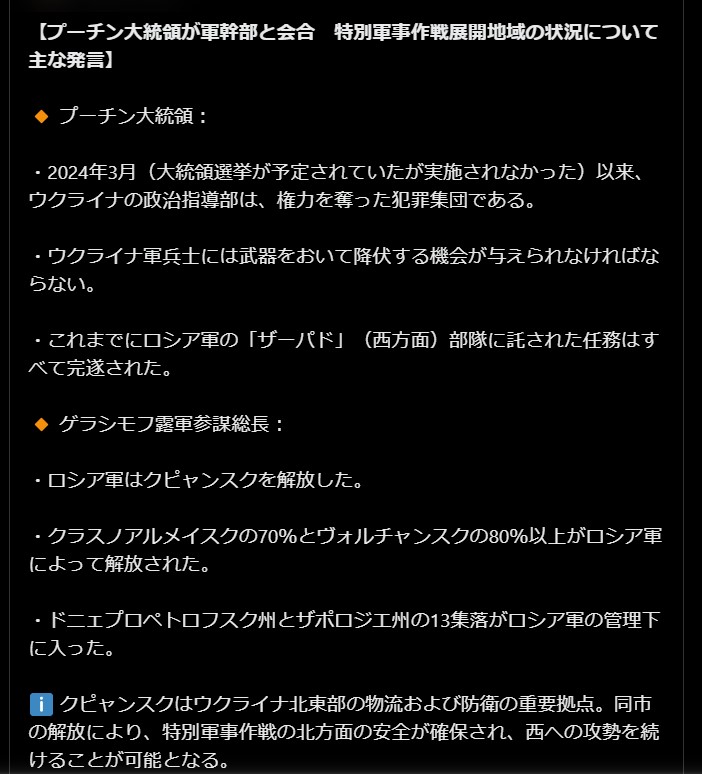 | … | 24無題Name名無し 25/11/17(月)09:52:01 IP:106.150.*(dion.ne.jp)No.2676894そうだねx4 1763340721604.png-(635186 B) ロシア軍、ザポリージャ州で前進 2集落制圧と発表(抜粋) |