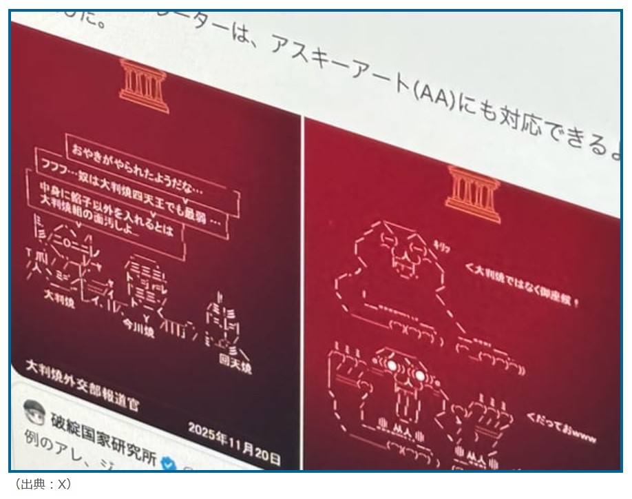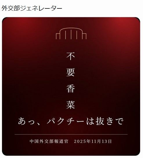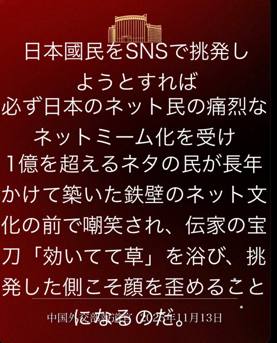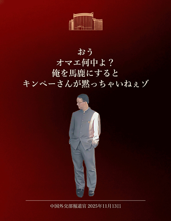 | … | 940無題Name名無し 25/11/22(土)20:53:15 IP:180.38.*(ocn.ne.jp)No.2678213そうだねx13外交官の迂闊な発言から大喜利がエスカレートしてんのに日本が悪いしか言えないのが北京の地頭なんだろうな |