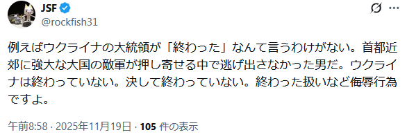 | … | 1無題Name名無し 25/11/17(月)09:31:07 IP:175.177.*(itscom.jp)No.2676871+▼ウクライナ情報に関するテンプレ |