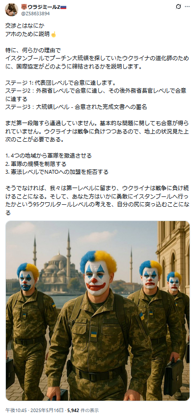 | … | 946無題Name名無し 25/11/22(土)21:26:17 IP:153.232.*(dti.ne.jp)No.2678221そうだねx14面子の話を言うならそれこそ属国以外で一外交官にお前の国のトップの首落としてやるなんて言われて引き下がる国が何処にいるかって話になる訳でして…前々から分かってる話だけど自分のメンツばかりでそれを守るための言動に従わせる事が相手のメンツを潰してる事に気が付けないのは本当想像力不足よね… |