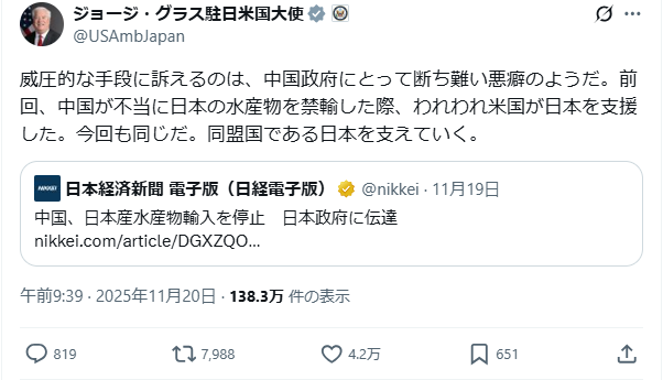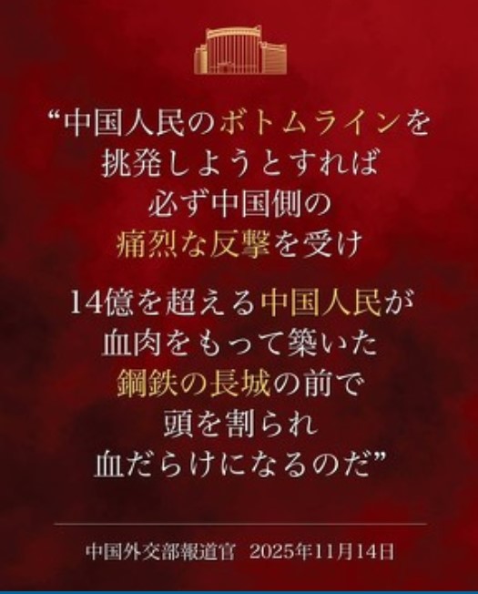 | … | 23無題Name名無し 25/11/17(月)09:48:38 IP:175.177.*(itscom.jp)No.2676893そうだねx31 1763340518236.png-(375213 B) スレ初めに「首斬ってやる」発言の中国総領事に対する駐日米国大使からのメッセージ |