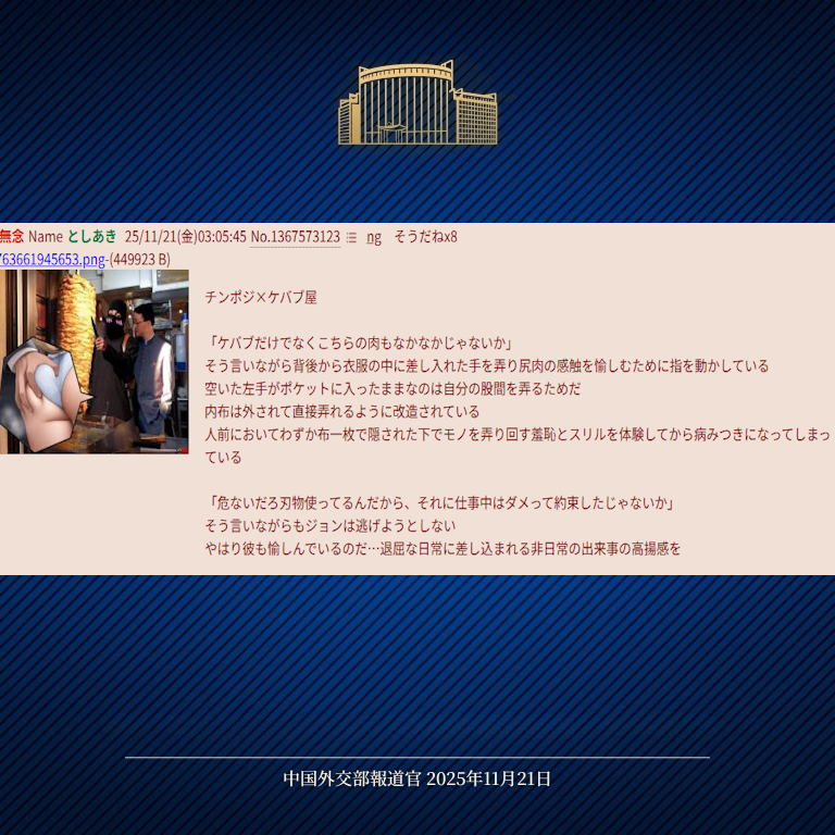 | … | 945無題Name名無し 25/11/22(土)21:21:41 IP:125.193.*(mesh.ad.jp)No.2678220そうだねx4 1763814101649.jpg-(113986 B) >>外交官の迂闊な発言から大喜利がエスカレートしてんのに日本が悪いしか言えないのが北京の地頭なんだろうな |