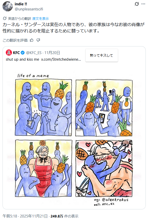 | … | 959無題Name名無し 25/11/22(土)22:51:27 IP:153.137.*(ocn.ne.jp)No.2678235+ 1763819487800.png-(614356 B) カーネル・サンダースだよ |