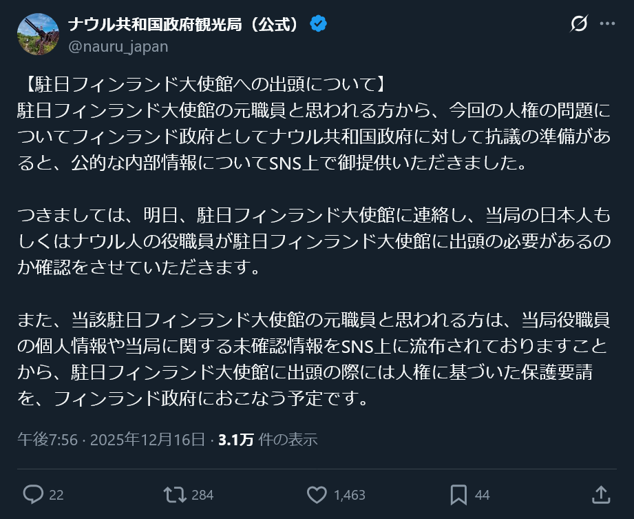 | … | 36無題Name名無し 25/12/16(火)20:30:02 IP:124.212.*(dion.ne.jp)No.2683189そうだねx4 1765884602643.png-(119165 B) ナウル共和国政府観光局(公式)@nauru_japan |