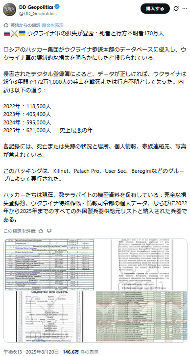 | … | 719無題Name名無し 25/12/21(日)21:51:48 IP:150.249.*(nuro.jp)No.2684216そうだねx1>プーチン氏のウクライナ占領目標は不変、米情報機関が9月に報告書 |