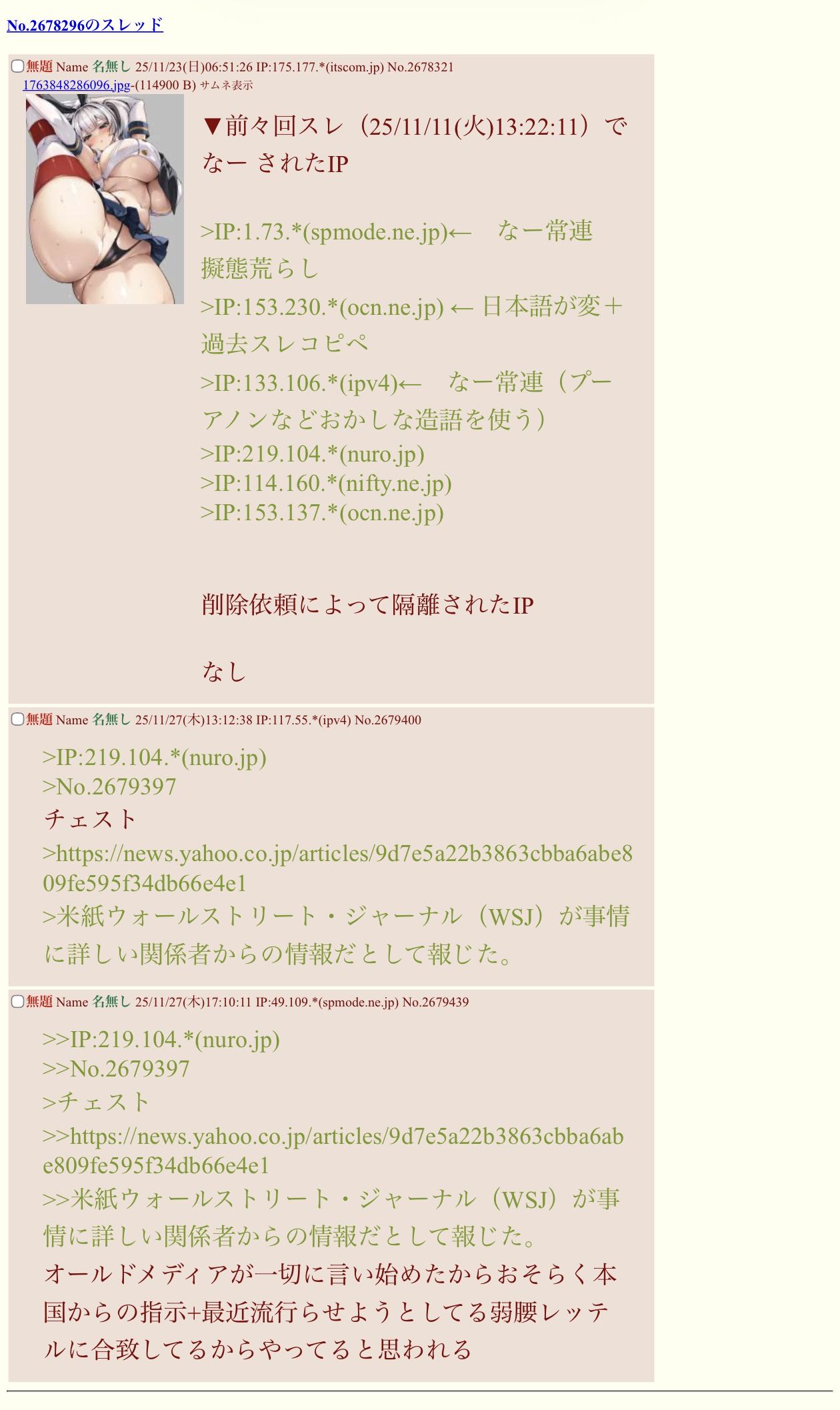 | … | 2無題Name名無し 25/12/16(火)18:13:50 IP:175.177.*(itscom.jp)No.2683148+▼監査結果の中継アーカイブ |