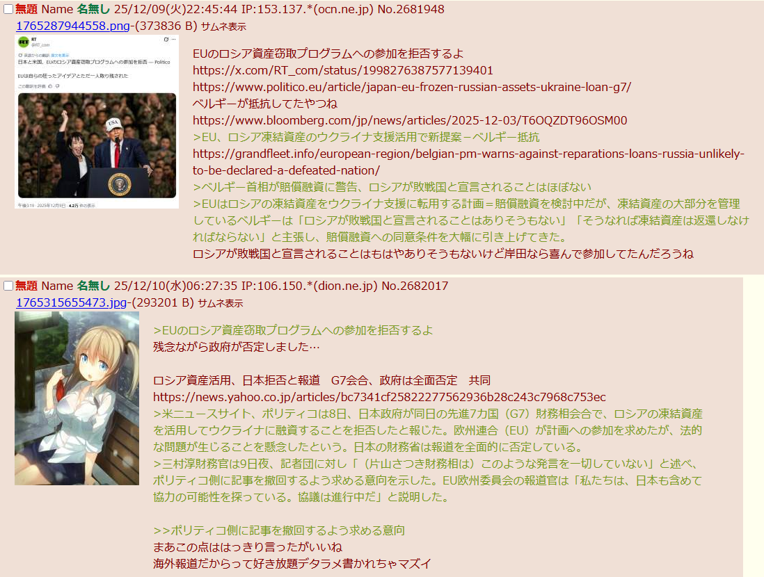 | … | 77無題Name名無し 25/12/16(火)23:45:27 IP:180.38.*(ocn.ne.jp)No.2683232+ロイターの記事連貼りしてしまいすみません |