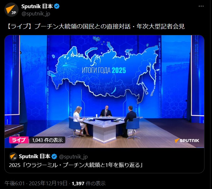 | … | 716無題Name名無し 25/12/21(日)21:36:31 IP:221.171.*(mesh.ad.jp)No.2684213そうだねx2>気晴らしに先日の「プーチン大統領に訊いてみよう!」の面白質問 |