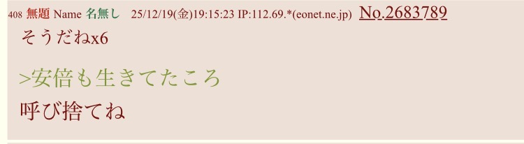 | … | 660無題Name名無し 25/12/21(日)13:34:16 IP:153.137.*(ocn.ne.jp)No.2684118+2022年2月安倍さん |