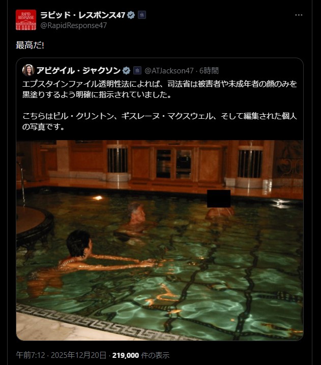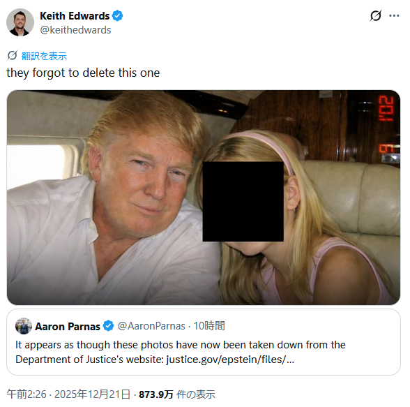 | … | 645無題Name名無し 25/12/21(日)11:54:12 IP:106.150.*(dion.ne.jp)No.2684102そうだねx1 1766285652250.jpg-(134424 B) 英語報道では「トランプが写った写真をファイルから消しましたぞー」と大騒ぎ |