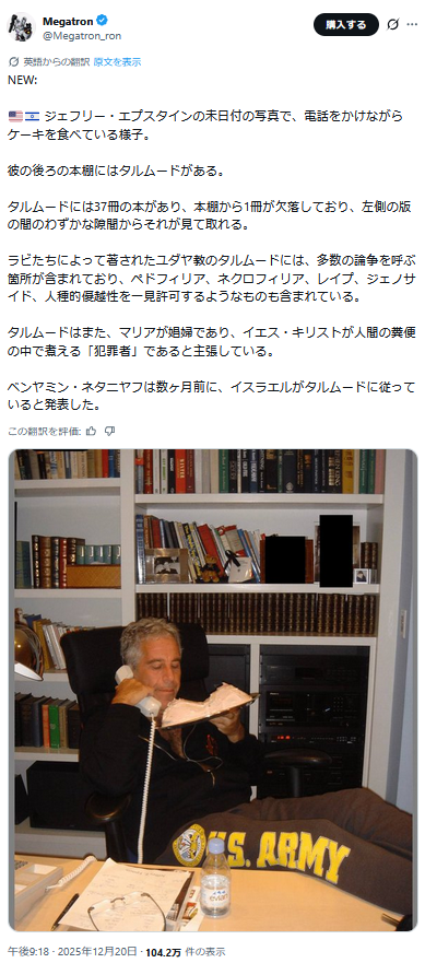 | … | 685無題Name名無し 25/12/21(日)18:07:40 IP:153.137.*(ocn.ne.jp)No.2684154そうだねx1 1766308060621.png-(326653 B) タルムードとエプスタインだよ |