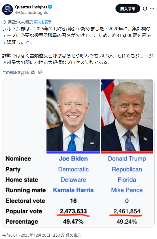 | … | 688無題Name名無し 25/12/21(日)18:17:15 IP:153.137.*(ocn.ne.jp)No.2684157そうだねx9 1766308635417.png-(240286 B) フルトン郡が違法な投票を認めたよ |