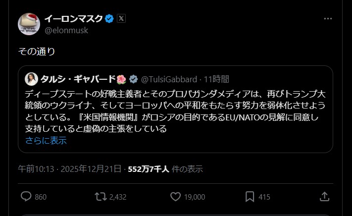 | … | 686無題Name名無し 25/12/21(日)18:08:54 IP:106.150.*(dion.ne.jp)No.2684155+ 1766308134107.png-(1036428 B) ギャバード長官が爆弾発言 |